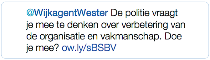 Nederland Werkt Online is betrokken bij de vorming van de Nationale Politie. Wij monitoren o.a. de social media. Er bleken 1190 wijkagenten actief op Twitter. Wij hebben hen allen via een speciaal aangemaakt Twitteraccount persoonlijk uitgenodigd voor een interne bijeenkomst. Hierbij een bloemlezing van de conversatie. Er is 485 keer doorgeklikt naar de aanmeldpagina, het […]